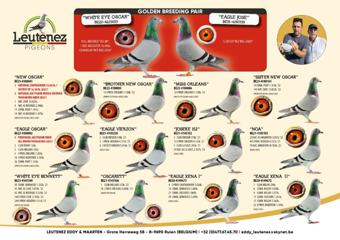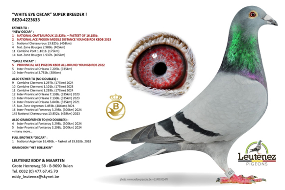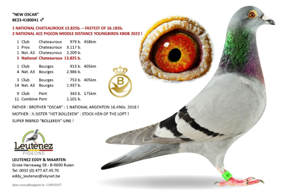 DNA 驗證: 超級配對----“白眼奧斯卡” x “奧斯卡直女”作出 ! 同父半兄鴿“新奧斯卡”B23-4180041灰公,榮獲2023年查特盧斯II國家賽 16,183羽總冠軍。2023年比利時KBDB中距離幼鴿全國鴿王亞軍 。 波治國家賽區 2.986羽4名 ,波治國家賽區 1.937羽14名 。 (半) 平輩榮獲 (無重複計算) : 威爾森聯省 4,131羽5名