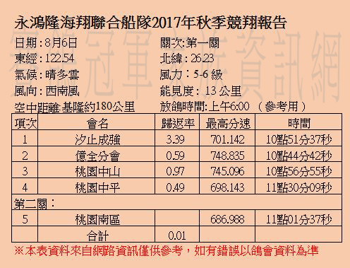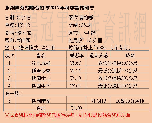 2017年永鴻隆聯合船隊春季比賽各關歸返率一覽表