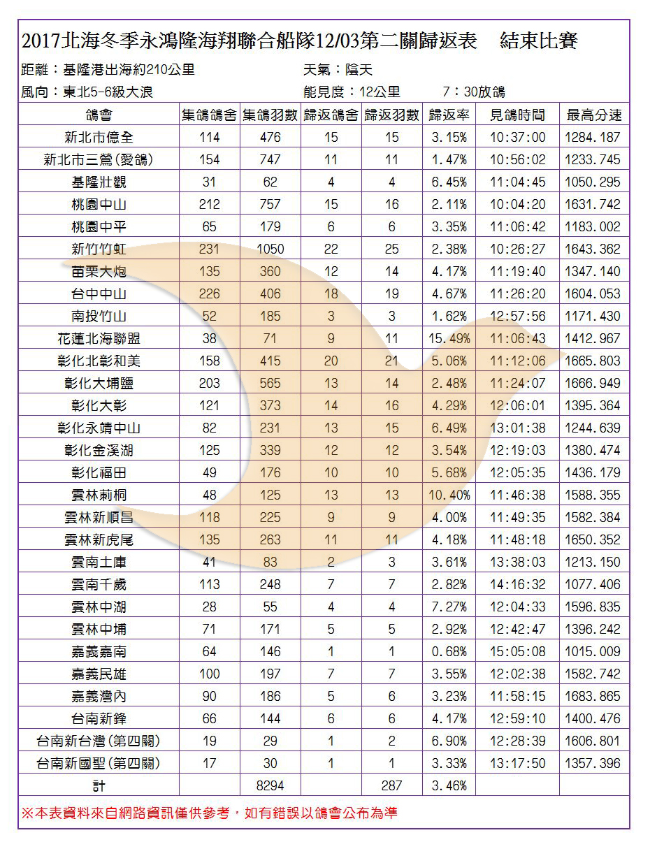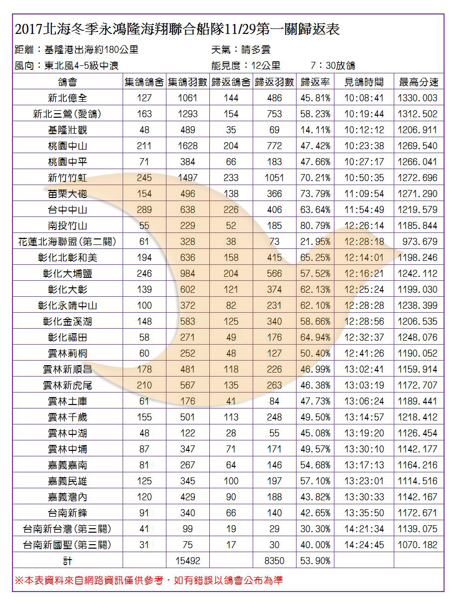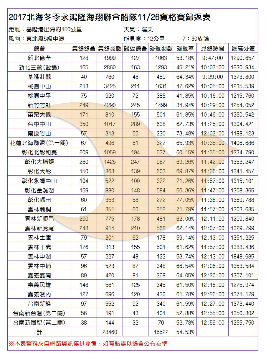 2017年永鴻隆聯合船隊冬季競翔各會歸返率一覽表