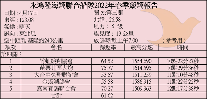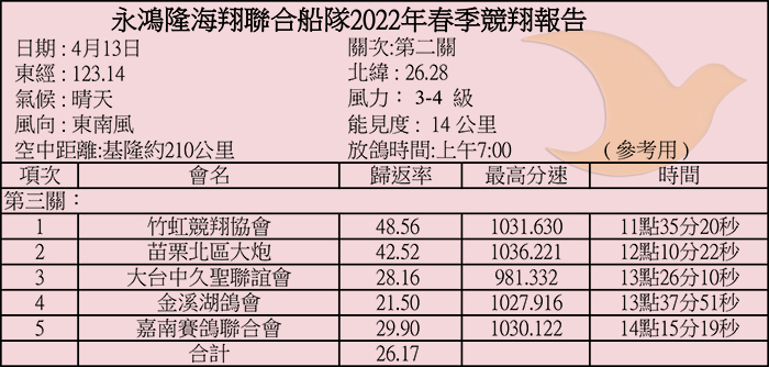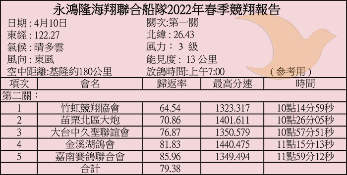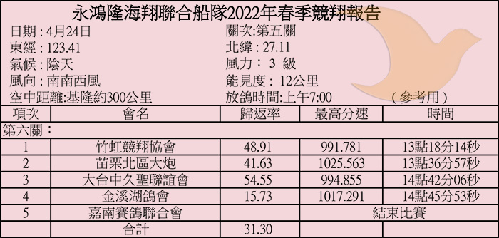 2022年永鴻隆聯合船隊春季比賽各關歸返率一覽表