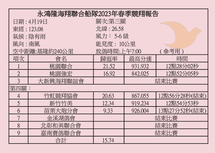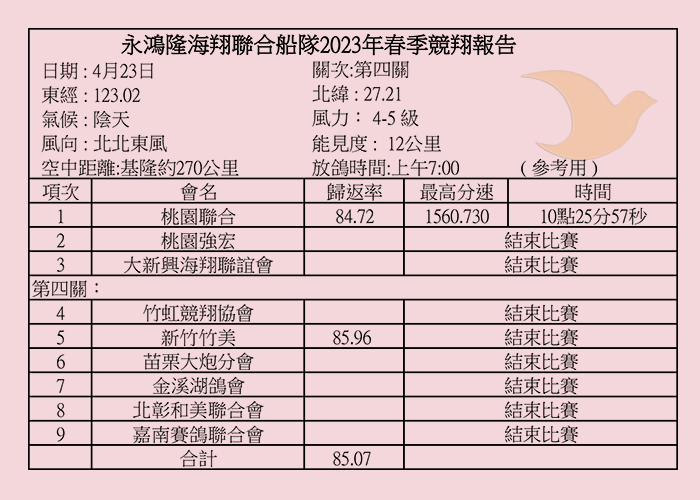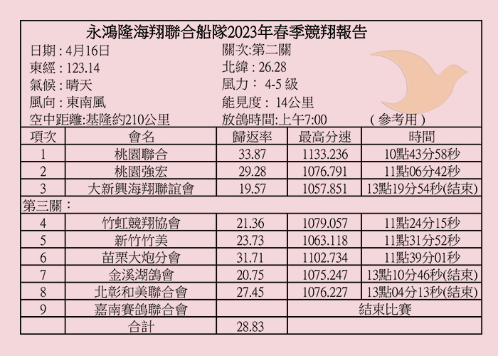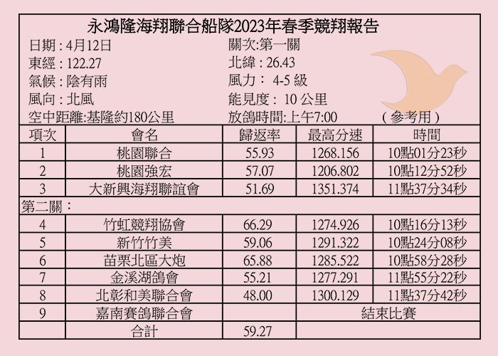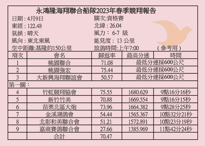 2023年永鴻隆聯合船隊春季比賽各關歸返率一覽表