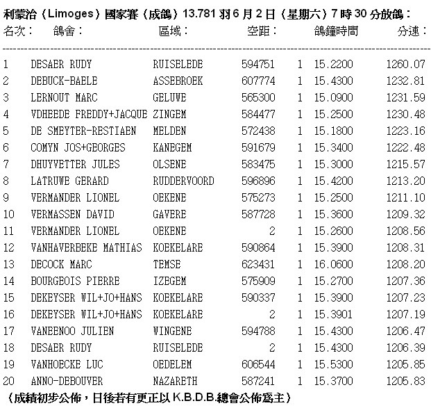 2012年比利時利蒙治(Limoges)成鴿國家賽報導: