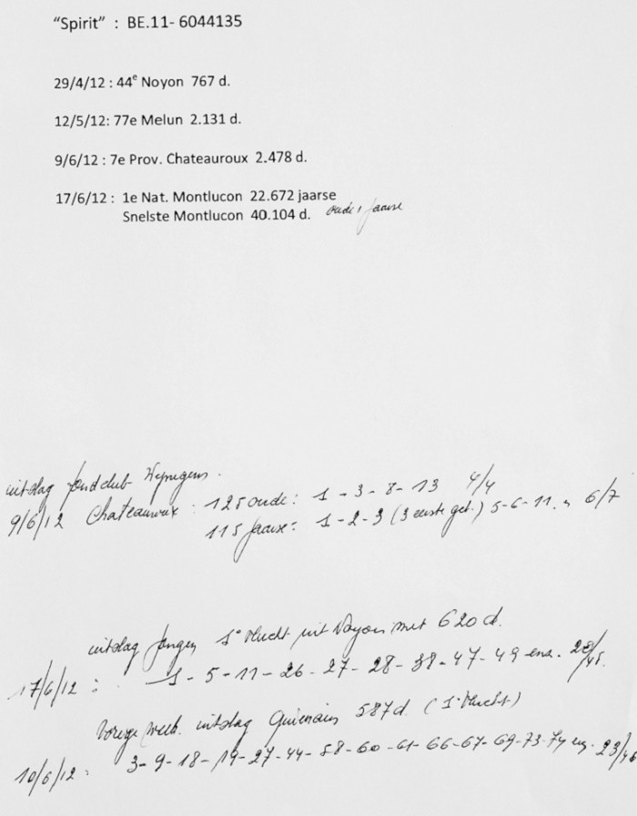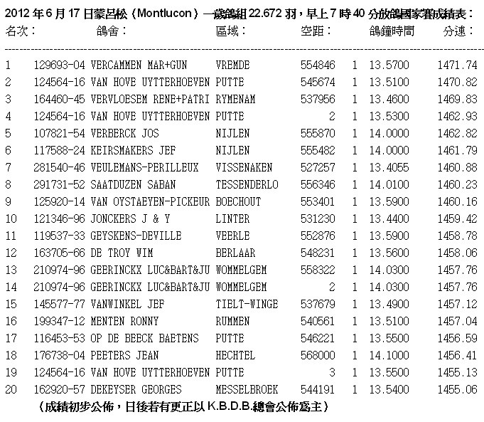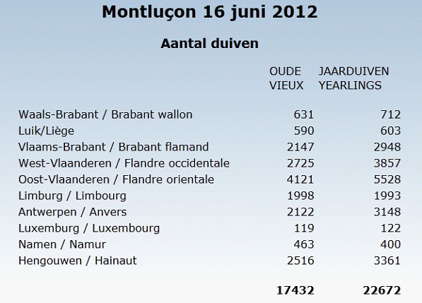 2012年比利時蒙呂松(Montlucon)國家賽(距離約570公里)於6月14日交鴿總數40.104羽,分為成鴿組17.432羽及一歲鴿組22.672羽參賽,於6月16日(星期六)早上要放鴿,因氣候不佳延後一日6月17日早上7時40分放鴿。