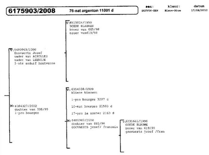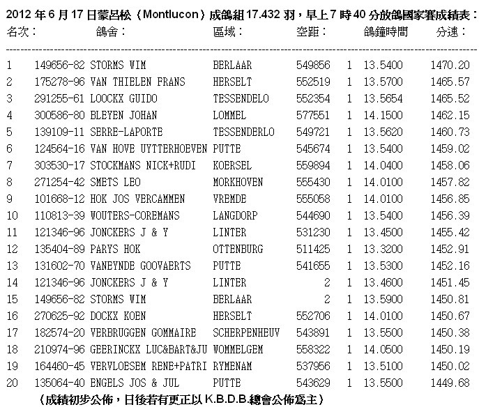 來自貝拉爾(Berlaar)的維姆.斯托姆斯(Wim Storms)鴿舍,獲得2012年蒙呂松國家賽成鴿組17.432羽冠軍,他的冠軍鴿平均分速為1469.16米/分。