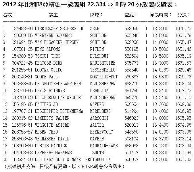 獲得一歲鴿組22.334羽全國冠軍為迪瑞克.佛斯赫斯.朱(DIERICKX-VISSCHERS JU)鴿舍,該舍1羽2011年出生的母鴿以1670.72公尺/分的高分速勇奪得冠軍,並且是亞精頓(Argenton)國家賽總數34.781羽的總冠軍鴿。