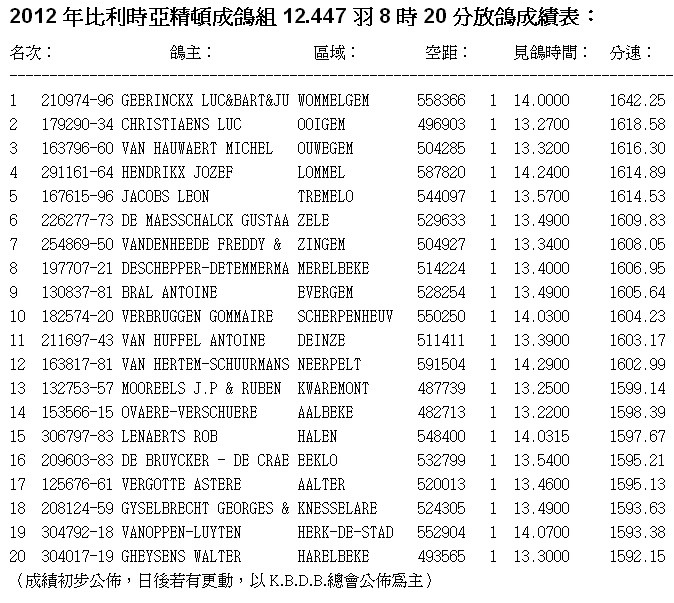 2012年比利時亞精頓(Argenton)國家賽於6月28日交鴿,分為成鴿組12.447羽、一歲鴿組22.334羽,合計總數34.781羽,較2011年集鴿數30.783羽,增加3.998羽。比利時中部地區空距約525公里,天氣狀況良好,晴天但是在法國局部地區有陣雨,75%的賽程都會有南-西南風的順風,6月30日上午8時20分放鴿。