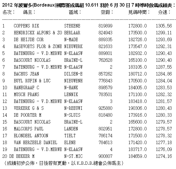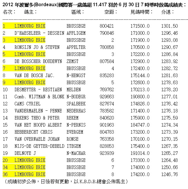 獲得波爾多(Bordeaux)國際賽一歲鴿組11.417羽冠軍為比利時強豪艾立克.林伯格(LIMBOURG ERIK)鴿舍,該舍今年大放異彩,除獲得冠軍外,在前40名次內佔8羽強,(分別入上冠軍、3、5、7、9、20、34、36),超強演出,另一強豪克利斯.賀伯瑞茲(HEBBERECHT CHRIS)鴿舍交鴿2羽也入賞1羽獲得全國16位佳績。