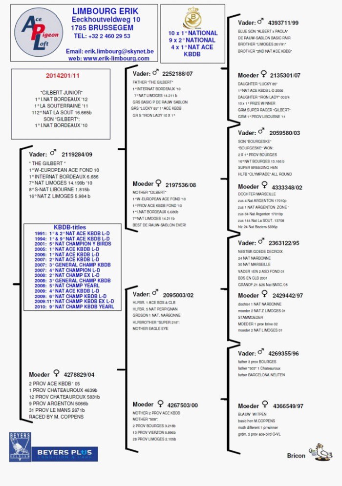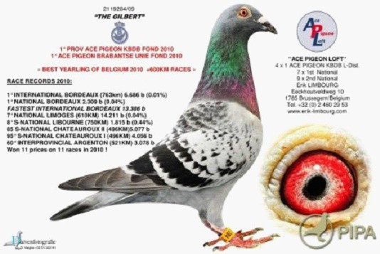 有其父必有其子,這也適用於波爾多國際冠軍“年輕吉伯特”(Gilbert Junior)B11-2014201班公,他是超級戰將“吉伯特”(Gilbert)B09-2119284的直子,“吉伯特”在2010年也曾獲得波爾多國際賽6.686羽一歲鴿冠軍,他還榮獲如下成績: