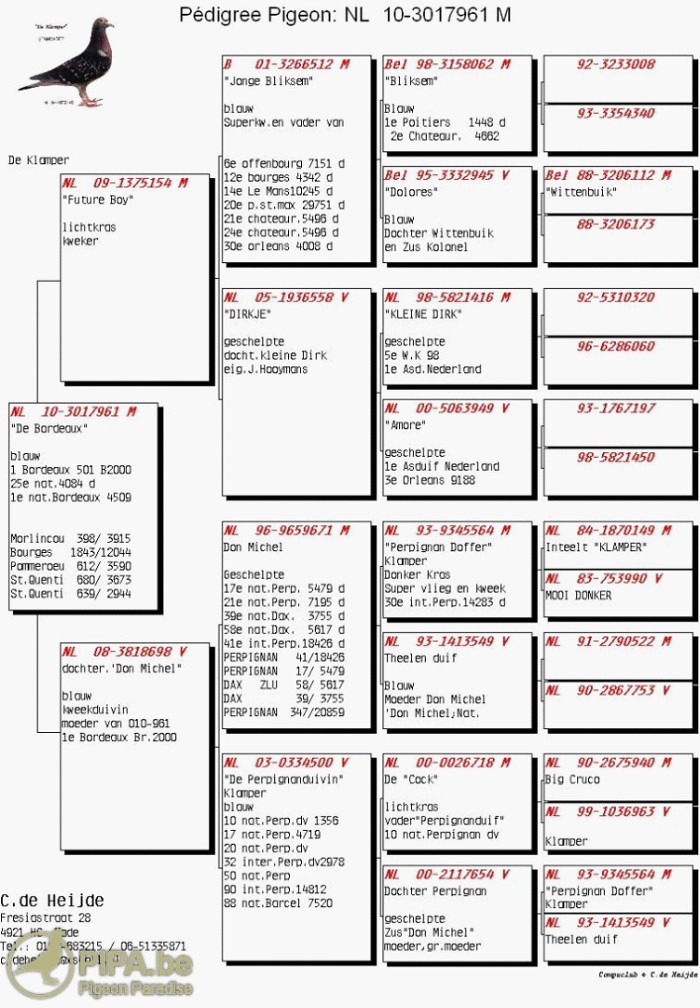 獲得2012年的波爾多(Bordeaux)國際賽荷蘭成鴿組4.507羽全國冠軍為荷蘭老將海德.柯爾(DE HEIJDE)鴿舍,該舍以一羽兩歲灰色公鴿NL10-3017961於當日下午18時27分26秒獲得荷蘭成鴿組冠軍,分速為1293公尺/分。這羽冠軍鴿擁有高人一等的貴族血源,即是2009年榮獲荷蘭當日歸長距離賽事鴿王得主“哈利號”(NL07-2007621楊胡曼斯鴿舍作出)的全弟NL09-1375154作出。“哈利號” 就是來自考布曼的黃金配對“小迪克”(NL98-5821416)配對愛神(NL00-5063949)的直女NL05-1936558去配蓋比的世界級名鴿”閃電號”直仔B01-3266512所作出直仔。