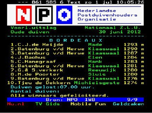“我曾想,我們可能不是唯一一家鴿子整群飛回來的鴿舍。”雨果.巴騰米衛依然沉浸在興奮之中,他說道,“我在這之前的馬拉松賽中,也沒有發生過這樣的情況。但是,不久之後,我才知道我是惟一一家獲得這樣成績的。這是多麼令人振奮。”這的確令人震撼。讓我們來看看他們的賽將,在這場比賽中所獲得的成績吧:
