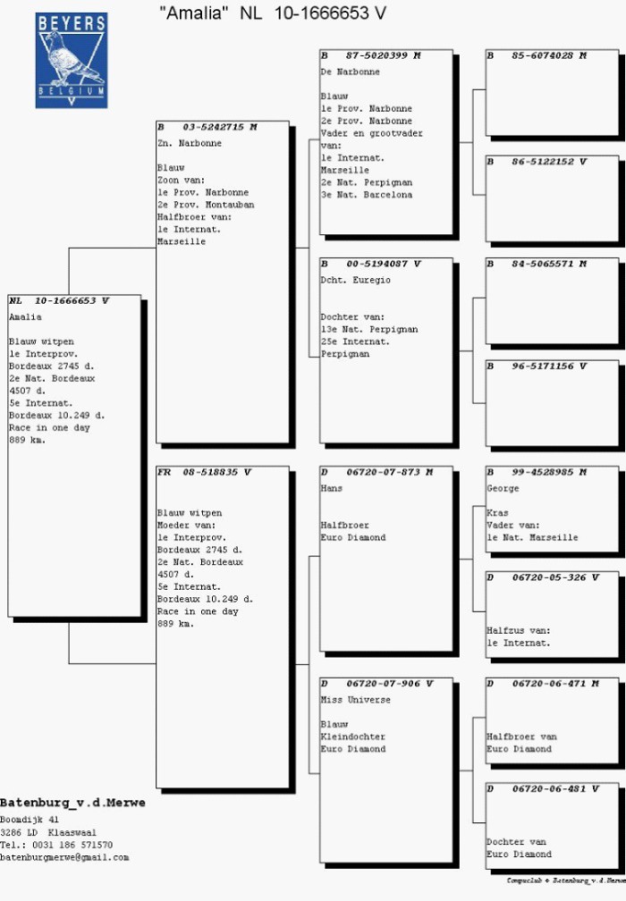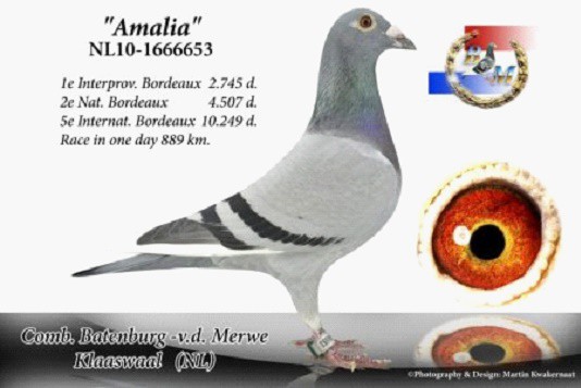 獲得波爾多國家賽亞軍和國際賽第5位的賽將是“阿瑪利亞”(Amalia, NL10-1666653灰母),這羽鴿子是巴騰伯格的好友艾迪.福頓(Ad Fortuin)給他的。這是因為巴騰伯格給斯特賴恩(Strijen)的艾迪鴿舍轉來了很多的鴿子,艾迪想要對此表示感謝。“阿瑪利亞”的父親是諾文-帕森(Nouwen-Paesen)的“拿邦號”(Narbonne)直子,這羽“拿邦號”獲得了拿邦全省冠軍和亞軍,還是一羽頂級種鴿。“阿瑪利亞”的母親是法國紅磨坊育種場(Moulin Rouge Breeding Stud)的一羽雌鴿,是出自2羽布洛坎普(Brockamp)原舍鴿的配對。