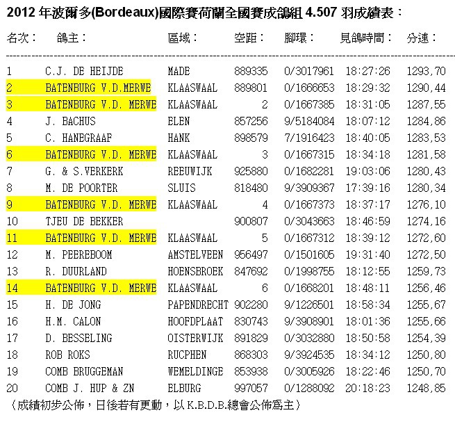 2012年的波爾多荷蘭成鴿組4.507羽全國冠軍為荷蘭老將海德 柯爾(DE HEIJDE)鴿舍
