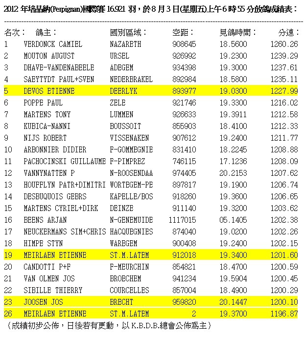 其他國內鴿友較熟悉的強豪有:獲得培品納(Perpignan)國際賽16.921羽第5位的艾天尼.迪沃斯(DEVOS ETIENNE)鴿舍、第19位及26位的倚天.梅爾浪(MEIRLAEN ETIENNE)鴿舍、第23名的喬斯.喬森(JOOSEN JOS)鴿舍等。