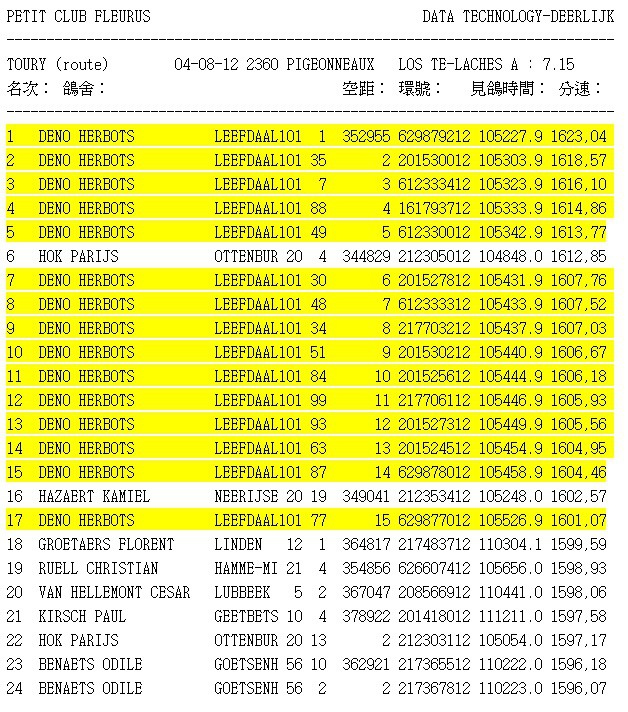 2012年8月14日比利時強豪迪諾.賀伯特所屬的俱樂部舉辦圖利(Toury 350公里)的競翔比賽,參賽鴿2.360羽於早上7點15分放鴿,飛翔3個半小時後見鴿,迪諾.賀伯特鴿舍一口氣包辦了前15名頭批鴿的名次,僅第6名是(HOK PARIJS)鴿舍的鴿子,其餘由迪諾一人全包所有名次(成績表如下)。
