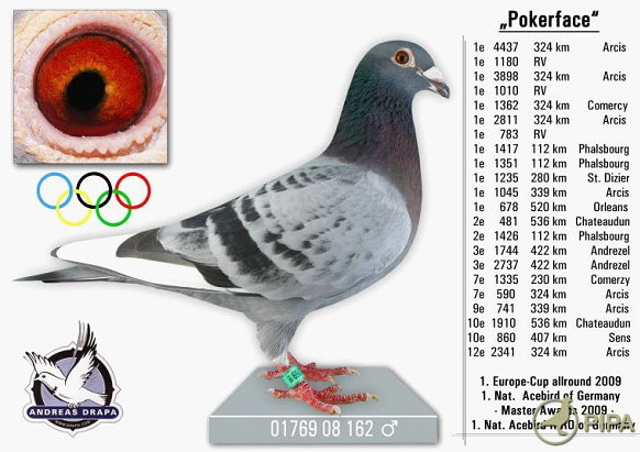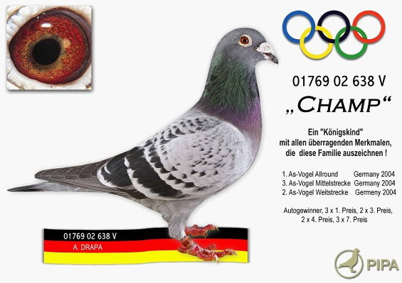 中獲得了第6名。而且你也可以在她的血統書上發現德拉帕鴿的蹤跡。梅爾普杰佛森的父親的環號為01769-09-1033,這羽鴿子同樣出自居住在柯尼希斯巴赫(Konigsbach-Stein)的大師安德列斯•德拉帕之手。另外還有很多德拉帕血統的鴿子獲得了前名次。我也想舉出些在其他公棚賽中獲得前名次的德拉帕賽鴿。這些成績再次說明優良血統從來不會撒謊,總是會隨時體現出自己的價值!