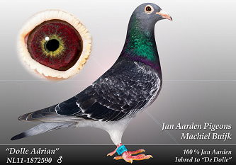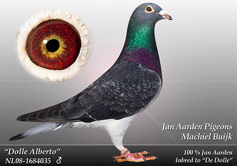 多利號斑白羽公鴿,它的眼睛非常漂亮,有著暗紅的深青棕綠色鴿眼,它的遺傳特性特別的強,以其奇特漂亮而有神的鴿眼、長距離與耐翔、遺傳穩定性。奠定了楊阿連鴿系,在五十年後的今天能再度轟動整個世界。