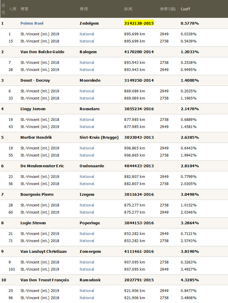 這項PIPA排行榜列出了最優秀的聖維仙賽鴿,已經公佈的2018和2019年聖維仙全國賽成績都被計入本項榜單。