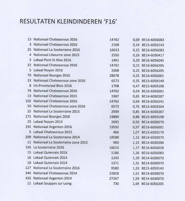 查特路全國32位“辛尼鑽石”(Cinneke Diamant BE16-6056205)為“阿爾貝托鑽石”的全姐妹,因此也是“F16”的另外一羽直孫女。第4輪也參加了幾場魁夫蘭賽和1場蘇普斯比賽。上週末“F16”的3羽幼鴿贏得魁夫蘭535羽亞軍、季軍和4位,這表明巴特和南茜擁有一支出色的一歲鴿戰隊來征戰明年的比賽。他們希望能夠在2018年取得佳績,我們相信他們能夠實現自己的目標。
