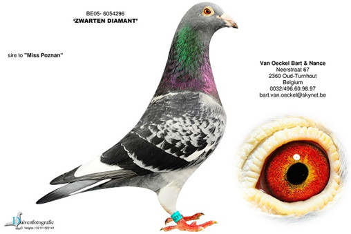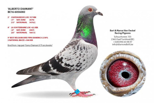 “阿爾伯托鑽石”現在獲得PIPA排行榜全國賽最佳幼鴿9位(2場比賽)。他贏得查特路全國14.762羽13位和拉索特年全國16.613羽25位。“阿爾伯托鑽石”的父親 “傑瑞鑽石”(Gerry Diamant)如同“匈牙利鑽石”一樣,出自“F16”X “黃金女郎”。他的母親出自“法蘭欣雌”(Francinneke),來自部分最著名的阿伯特.德瓦-盧克塞姆(Albert Derwa-Luxem)血系。“法蘭欣雌”出自“貝克斯”(Berkes)著名直子(BE10-2007030),可能是“寶琳”(Paulien BE06-2090139)最著名的後代。