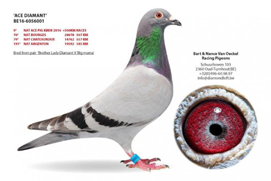 “鴿王鑽石”贏得2016年全國幼鴿組鴿王9位,還獲得波治全國28.078羽70位、查特路全國14.762羽79位和亞精頓全國19.592羽19位。父親BE14-6316876出自“F16” X “黃金女郎”(Golden Lady)。這羽賽鴿贏得拉索特年全國4位、布洛瓦全省4位和蒙呂松全省4位、圖勒全省7位。“鴿王鑽石”的母親為“大媽媽”(Big Mama),作育子代獲得PIPA排行榜6場全國賽最佳幼鴿45位。