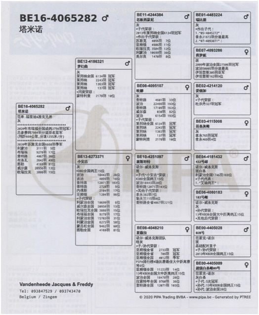 他們的前3位並不是平凡的賽鴿。全國冠軍(BE16-4065282灰公)已經獲得蘇雅克全國季軍、威爾森全國13位、歐瑞拉克全國15位、布瑞福全國17位等,這是一羽極具天賦的賽鴿!