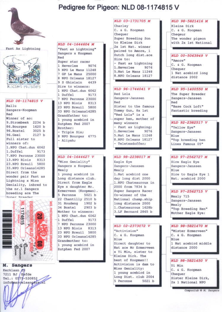 * 父: 鷹眼(Eagle Eye)2000年NPO全國當日歸長距離鴿王冠軍