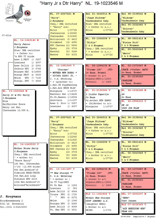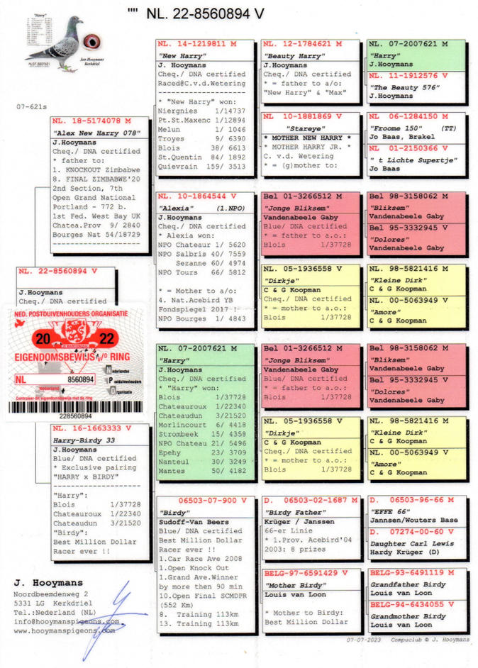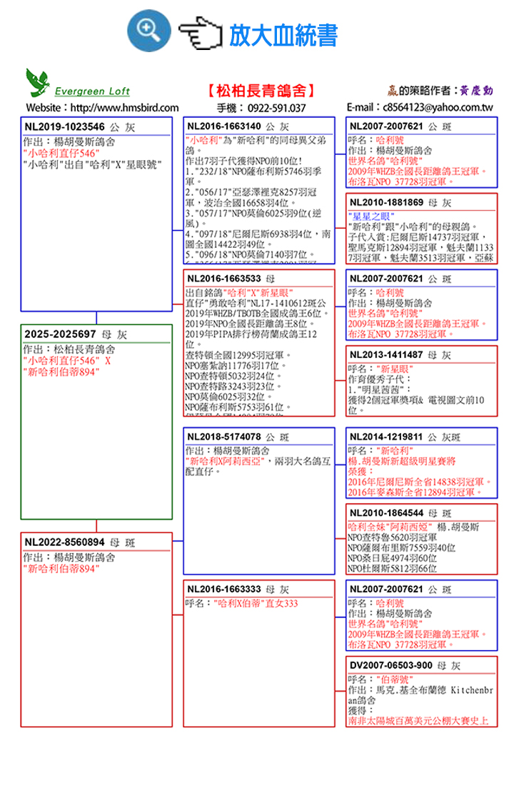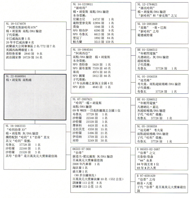 ● 外祖父鴿:NL07-2007621斑公 ,世界級名鴿 ”哈利號”。