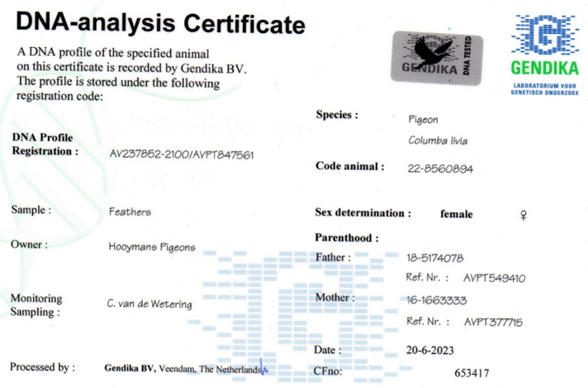 “小哈利直仔546” NL19-1023546 灰公 D.N.A.檢驗證明書