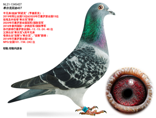 “希爾克近親427” NL21-1345427 斑公血統書 描述: 父親出自巴賽隆納全國冠軍“希爾克”x其半兄弟的頂尖回血鴿 母親是全國頂尖賽將“阿諾克”之母,出自神奇配對“宙斯”x“希爾克” - - x - - x - - x - - x - - x - - x - - x - - x - - x - - x - - x - - x - - x - - x - - x - - x - - x - - x- - x - - x - - x – ●父鴿:NL20-1166256“希爾克直子256”,耶勒瑪原舍回血雄 —其母親“希爾克”NL15-1320979斑母, 榮獲: 2020年巴賽隆納全國冠軍/國際亞軍。 2016年拿邦國際一歲鴿亞軍/國際季軍。(一歲鴿時參加非常艱難的一屆拿邦賽) 2018年波品納全國137位 2018年巴賽隆納全國157位 2017年馬賽全國157位 2019年巴賽隆納全國190位 2019年波品納全國196位 2016年波爾多全國631位