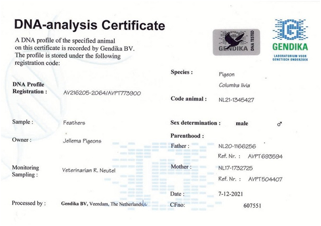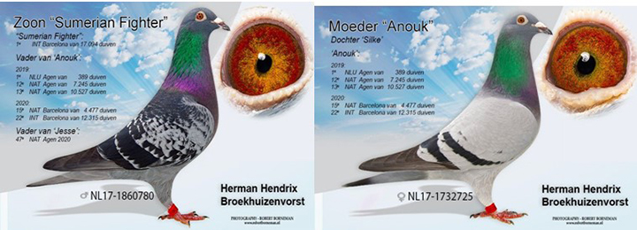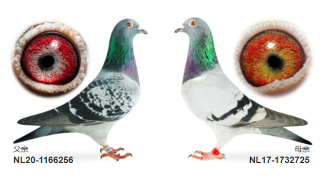父鴿:NL20-1166256斑公,2020年巴賽隆納全國冠軍/國際亞軍“希爾克”NL15-1320979斑母直子。 母鴿:NL17-1732725灰母,2020年巴賽隆納全國冠軍/國際亞軍“希爾克”NL15-1320979斑母直女。