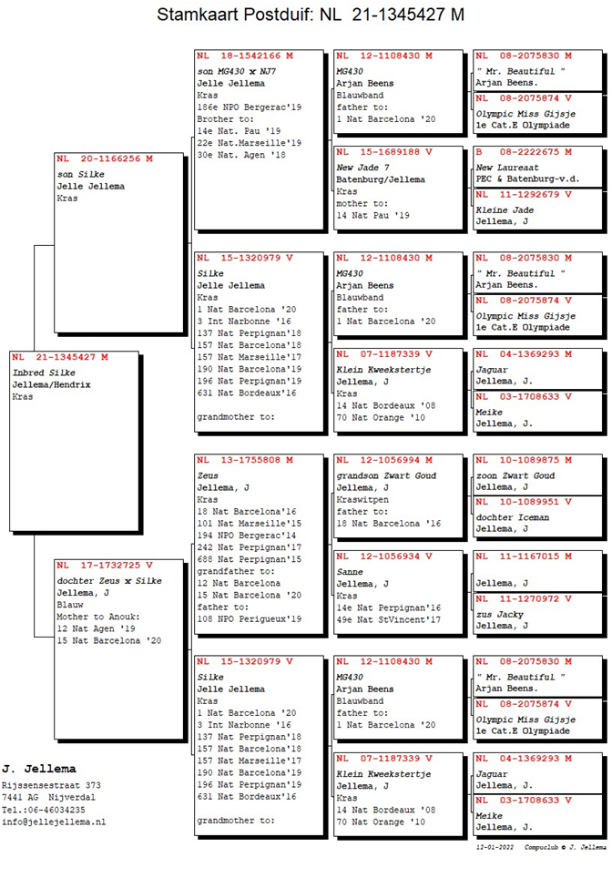 2016年巴賽隆納全國18位 2015年馬賽全國101位 2014年NPO貝吉拉克194位 2017年波品納全國242位 2015年波品納全國688位 —作育孫代獲得: 巴賽隆納全國6,178羽12位(阿蘭.德爾胡夫使翔) 2019年阿讓全國一歲鴿10,527羽13位/389羽冠軍/NPO 2,866羽4位(賀爾曼.亨德里克使翔) 2020年巴賽隆納全國4,447羽15位/國際12,315羽22位(賀爾曼.亨德里克使翔) —其母親“珊妮”獲得: 2016年波品納全國14位 2017年聖維仙全國49位 2015年NPO貝吉拉克57位 2016年波城全國87位 2014年NPO布瑞福93位 以及全國460.-697.-822位 —外祖母鴿:“希爾克”榮獲: 2020年巴賽隆納全國冠軍/國際亞軍。 2016年拿邦國際一歲鴿亞軍/國際季軍。(一歲鴿時參加非常艱難的一屆拿邦賽) 2018年波品納全國137位 2018年巴賽隆納全國157位 2017年馬賽全國157位 2019年巴賽隆納全國190位 2019年波品納全國196位 2016年波爾多全國631位 —“希爾克”作育孫代獲得: 2021年巴賽隆納全國6位 NL17-1732264灰公 巴賽隆納全國6,178羽12位 2019年阿讓全國一歲鴿10,527羽13位 NL18-1274999斑母 2020年巴賽隆納全國15位 NL18-1274999斑母 2020年巴賽隆納全國24位 NL17-1732264灰公 2020年巴賽隆納全國40位 NL17-1732313灰母 “阿諾克” NL18-1274999斑母,獲得2020年巴塞羅那荷蘭全國4477羽15位/國際12315羽21位 其父親是“蘇美爾狂戰士直子”(Son Sumerian Fighter NL17-1860780班公), “蘇美爾狂戰士”(NL10-3025405 Sumerian Fighter)為萊昂.洛克斯(Leon Roks)獲得巴塞羅那國際賽17026羽冠軍.“阿諾克”的母親是“希爾克直女”(NL17-1732725灰母),她是“希爾克”(NL15-1320979 Silk)的直女,而她也沿著“蘇美爾狂戰士”的足跡,獲得巴塞羅那全國4477羽冠軍. 連絡人:黃慶勳 電話:0922-591037 加line:0922591037 |