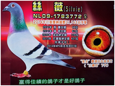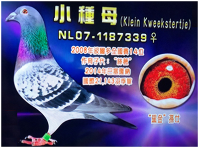 ~ “小種母”作育子代代表: 1.“席爾維婭”:2015年“長距離聯合會2000”俱樂部長距離鴿王冠軍 2015年“菲安特”俱樂部長距離鴿王冠軍 ... NPO/全國94.-158.-173.-185.-335位 ~子代:NPO/全國35.-127.-172位 2.“絲薇”:2014年巴賽隆納全國季軍/國際20,669羽季軍。 2012-2014年巴賽隆納國際14位(1258公里)。 2011年馬賽全國46位、2011年橘郡全國61位、全國116.-421.-457位 ~孫代“達芙妮”:2016年波品納全國季軍(一歲鴿組冠軍) ~孫代(艾迪.福泰因):2018年阿讓國際冠軍 ~孫代(馬克.吉伯特):2018年波品納BICC全國冠軍(1014公里) 2018年馬賽BICC全國亞軍(1013公里) … 2019年波城國際5位 2018年帕拉莫斯全國7位(1102公里) … 2019年聖維仙全國10位