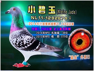 - “小碧玉”: 2014年巴賽隆納全國5,423 羽冠軍 2014年巴賽隆納國際 20,669羽冠軍 獲得史上翔距最大的國際冠軍 - 1258公里 2014年NPO布瑞福32位 !! 超級種母 !! —“新榮耀號”X“小碧玉”配對的雙重孫女作育子代獲: 2021年黃金阿爾加維公棚賽決賽冠軍(阿提米克斯)