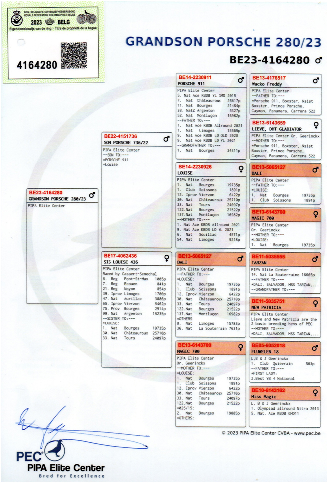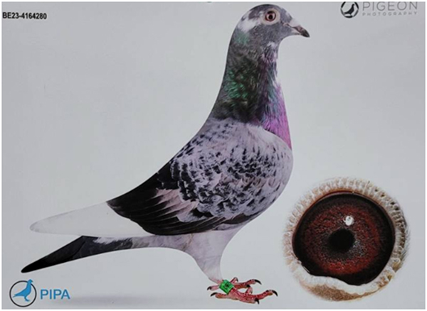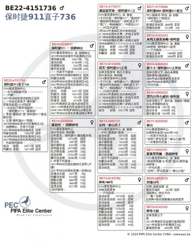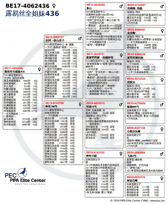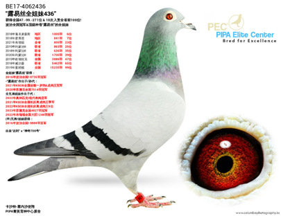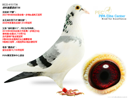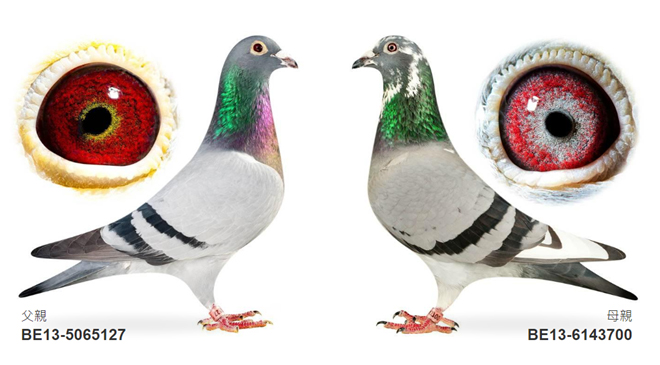父鴿:B22-4151736灰白羽,公,PIPA育種中心,世界名鴿”保時捷”直子。 母鴿:B17-4062436灰母,波治全國冠軍著名的「露易絲」的全妹鴿,來自頂尖配對“達利” x “神奇700號”。