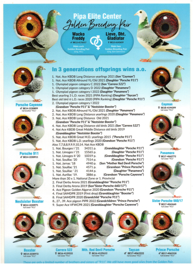 描述: 2021年KBDB全國全能鴿王冠軍「露娜」的全兄弟 出自超級配對:「保時捷911」X「露易絲」 - - x - - x - - x - - x - - x - - x - - x - - x - - x - - x - - x - - x - - x - - x - - x - - x - - x - -x - - x - - x 父鴿:B22-4151736灰白羽,公 ▲全兄弟姊妹代表: 1.「露娜」:2021年KBDB全國全能一歲鴿&成鴿王冠軍 2.一羽全兄弟作育子代「摩利斯」:2020年蘇雅克全國7,514羽冠軍 ~ 「摩利斯」作育子代代表: ① . 「摩利斯II世」(087/22 ) :2023年蘇雅克全國6,085羽冠軍 ② .「保時捷II世」 (247/21):2022年PIPA排行榜比利時4場長距離賽最佳一歲鴿亞軍,2022年KBDB全國長距離一歲鴿王5位 ●祖父鴿:BE14-2230911 “保時捷911 ” ,PEC頭號種鴿,出自“威寇福雷迪” X“莉芙” , 本身榮獲: 2015年KBDB全國大中距離一歲鴿王5位 查特路I全國25,710羽7位 波治全國21,522羽11位 蒙呂松全國16,982羽52位 亞精頓I全國大區5,327羽38位 —「保時捷911 」作出子/孫代: 2021年KBDB全國全能一歲鴿&成鴿鴿王冠軍 2023年KBDB全國長距離一歲鴿王冠軍 2020年PIPA排行榜6場長距離賽比利時最佳成鴿冠軍 2023年PIPA排行榜4屆全國賽比利時最佳幼鴿冠軍 2022年奧林匹克I組代表鴿亞軍 2021年「世界最佳鴿」比利時全能亞軍 2021年KBDB全國長距離成鴿王季軍 以及KBDB全國鴿王4.-5.-7.-9.-9位 2021年波治I全國34,311羽冠軍 2021年利蒙治I全國15,547羽冠軍 2020年利蒙治II全國10,319羽冠軍 2020年蘇雅克全國7,514羽冠軍 2023年蘇雅克全國4,827羽冠軍 2022年蘇雅克全國4,476羽冠軍 2023年萊邦納全國3,880羽冠軍 以及其它多個全國前10位 9個公棚賽鴿王冠軍、6個公棚賽決賽冠軍、5個公棚賽決賽亞軍 獲得許多全國前10位入賞 獲得9個公棚賽鴿王冠軍、6個公棚賽決賽冠軍、5個公棚賽決賽亞軍 —「保時捷911 」的多羽全兄弟姊妹是超級鴿 母鴿:B17-4062436灰母,波治全國冠軍著名的「露易絲」的全姊妹,來自頂尖配對“達利” x “神奇700號”