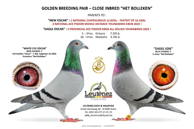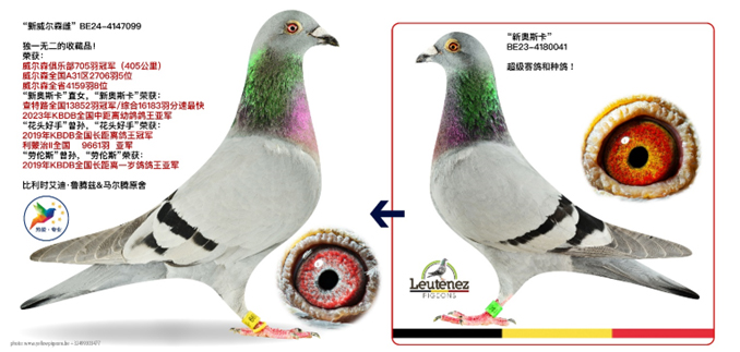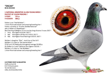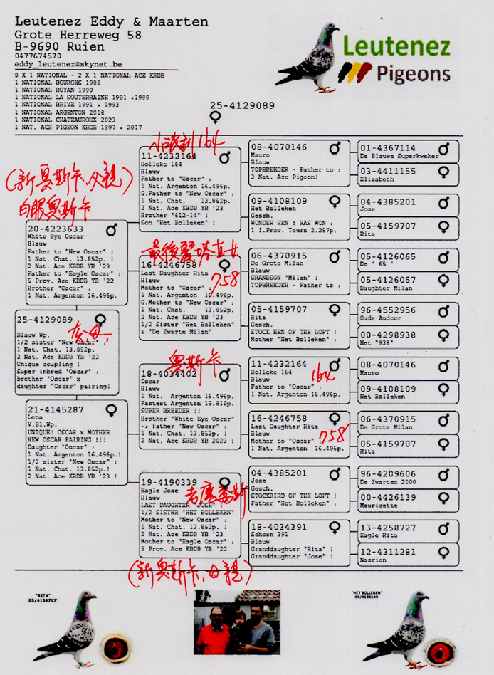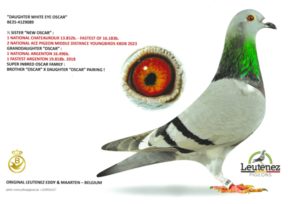 DNA 驗證: 超級配對----“白眼奧斯卡” x “奧斯卡直女”作出 ! 同父半兄鴿“新奧斯卡”B23-4180041灰公,榮獲2023年查特盧斯II國家賽 16,183羽總冠軍。2023年比利時KBDB中距離幼鴿全國鴿王亞軍 。 波治國家賽區 2.986羽4名 ,波治國家賽區 1.937羽14名 。 (半) 平輩榮獲 (無重複計算) : 威爾森聯省 4,131羽5名