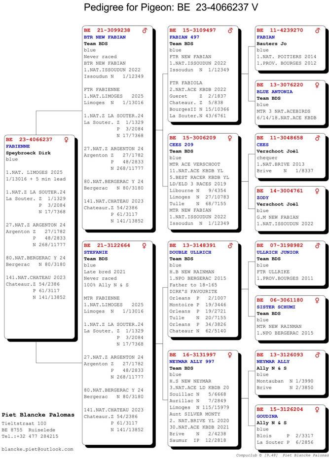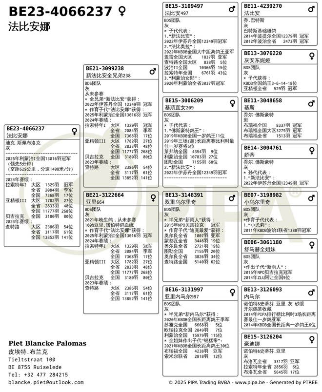 獲得2025年比利時利蒙治I國家賽(約550公里~680公里)成鴿13.016羽全國冠軍是迪克.斯佩布洛克(Speybroeck Dirk)團隊,冠軍鴿B23-4066237灰.母是在5月30日(星期五)下午 14:27分完成打鐘,空距為629.806公里,,平均分速為1408.86 米/分。