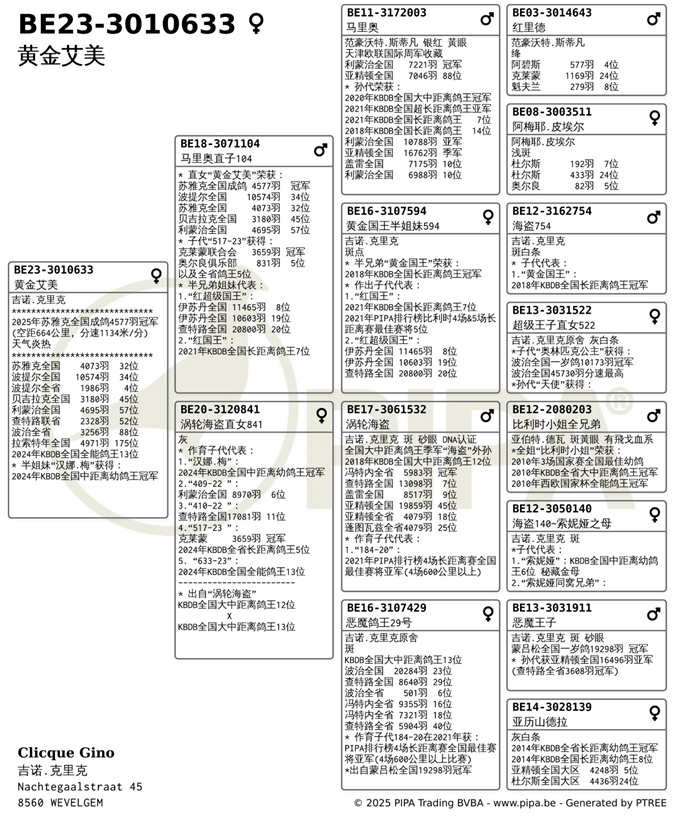 2025年比利時蘇雅克"成鴿"4.577羽全國冠軍是吉諾.克裡克( Clicque Gino )鴿舍,該舍冠軍鴿B23-3010633灰母是在7月12日(星期六)下午16時30 分完成打鐘,空距為664.741公里,平均分速為1134.4 米/分。
