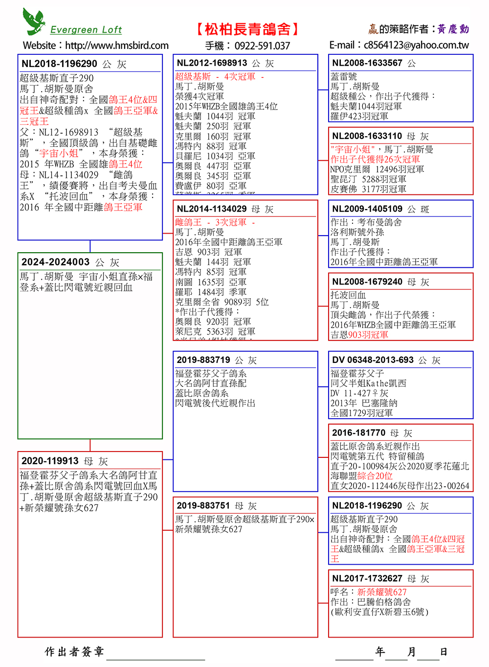 4、24-2024003灰.公,特留種鴿,掛私環。 父鴿:NL2018-1196290 公.灰,”超級基斯直子290”馬丁.胡斯曼原舍,”超級基斯”獲得2015 年 WHZB 全國雄鴿王4位。 母鴿:20-119913灰母,”超級基斯直子290”直孫,”超級基斯”獲得2015 年WHZB 全國雄鴿王4 位。