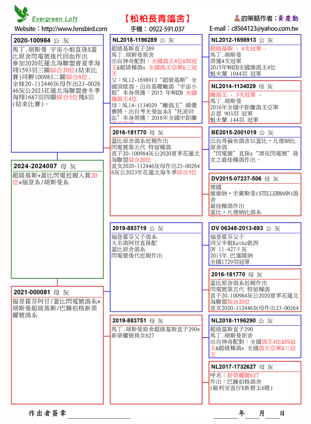 7、24-2024007灰.母,特留種鴿,掛私環。 父鴿:20-100984灰.公,參加2020花蓮北海聯盟會夏季海翔1593羽三關綜合20位(結束比賽)同 孵100983二關綜合6位,全妹20-112446灰母作出23-002646灰公2023花蓮北海聯盟冬 季海翔1687羽四關綜合5位殘8羽(結束比賽)。 母鴿:21-000081灰母,”超級基斯直子290”直孫,”超級基斯”獲得2015 年WHZB 全國雄鴿王4 位。