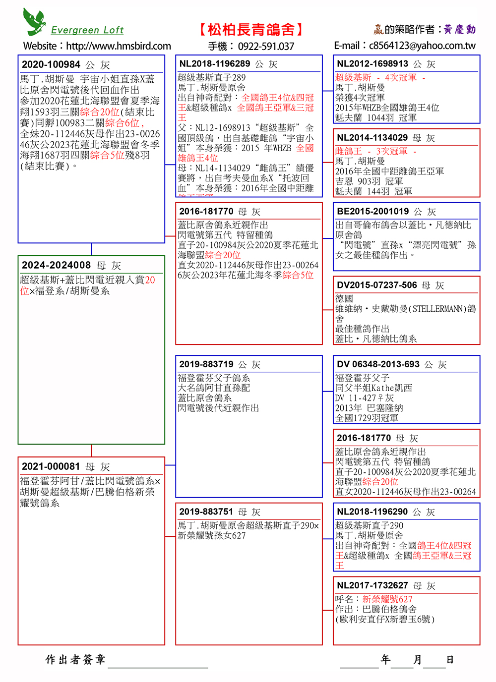 8、24-2024008灰.母,特留種鴿,掛私環。 父鴿:20-100984灰.公,參加2020花蓮北海聯盟會夏季海翔1593羽三關綜合20位(結束比賽)同 孵100983二關綜合6位,全妹20-112446灰母作出23-002646灰公2023花蓮北海聯盟冬 季海翔1687羽四關綜合5位殘8羽(結束比賽)。 母鴿:21-000081灰母,”超級基斯直子290”直孫,”超級基斯”獲得2015 年WHZB 全國雄鴿王4 位。
