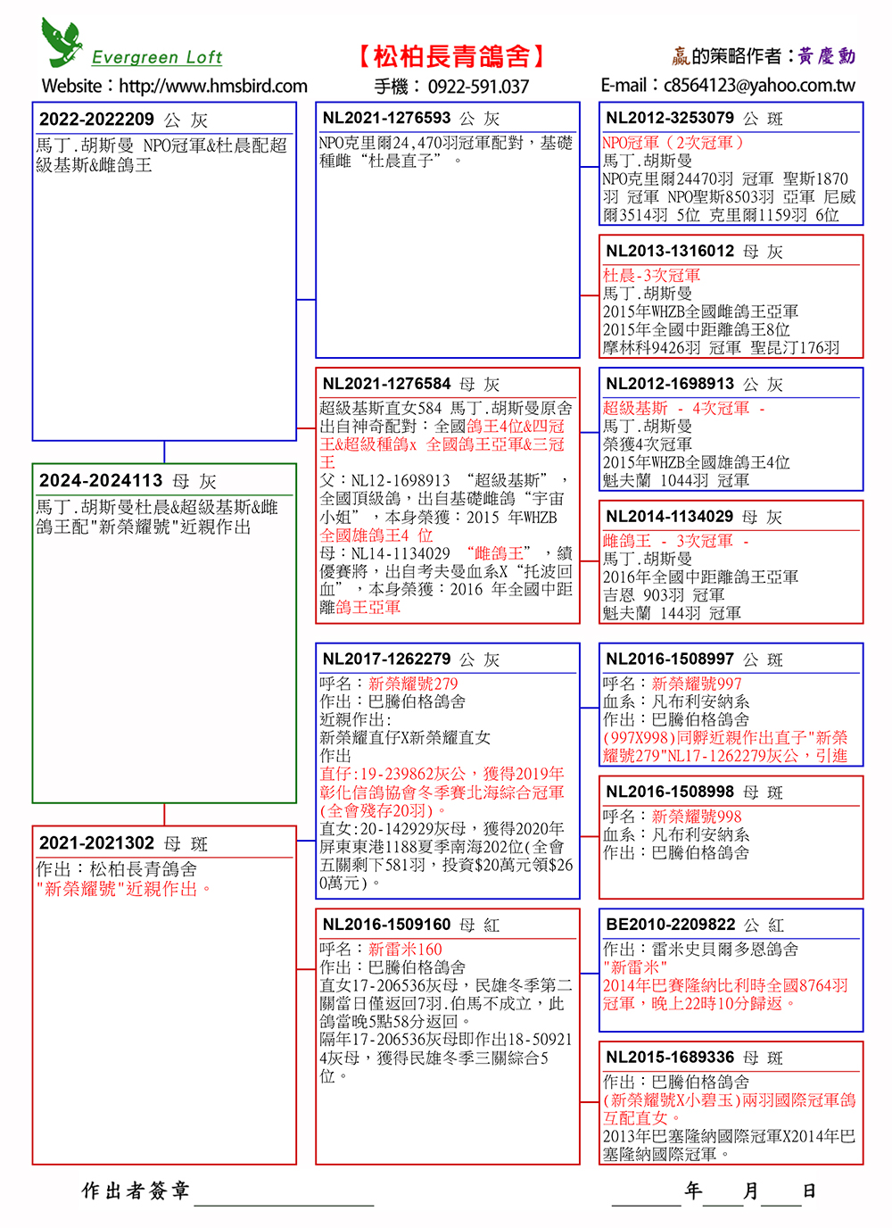 9、24-2024113灰.母,特留種鴿,掛私環。 父鴿:22-2022209灰.公,”超級基斯直女584”直子,馬丁.胡斯曼出自神奇配對:全國鴿王4位& 四冠王&超級種鴿x 全國鴿王亞軍&三冠王。 母鴿:21-2021302斑母,"新榮耀號近親279”直女,279已作出19-239862灰公,獲得2019年彰 化信鴿協會冬季賽北海綜合冠軍(全會殘存20羽)。