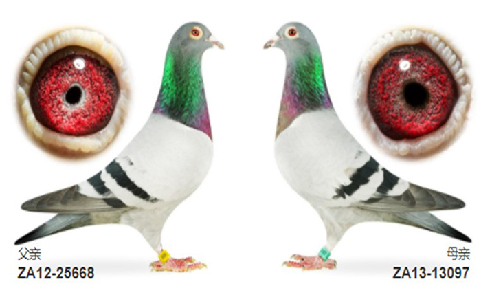 父鴿:ZA12-25668灰公,出自兄妹近親配對:父母均出自“泰瑞”X“伯蒂”直子。 母鴿:ZA13-13097灰母,出自兄妹近親配對:父母均出自“泰瑞”X“伯蒂”直女。