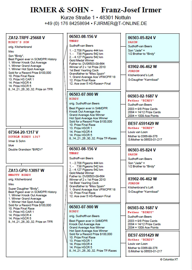 世界名鴿:DV06503-07-900 灰母 “伯蒂號” 描述: 超級血系鴿,出自兄妹近親配對:父母均出自“泰瑞”X“伯蒂” - - x - - x - x - - x - - x - - x - - x - - x - - x - - x - - x - - x - - x - - x - - x - - x - - x - - x - ▲本拍賣鴿出自“伯蒂”的直子X“美麗伯蒂”,父母均出自“伯蒂”X“泰瑞” ●祖父&外祖父:DV06503-08-156 “泰瑞”,出自“薩克森”X“喬丹”, 本身榮獲: 2010年一歲雄鴿王冠軍。 一歲鴿參賽2次冠軍。 皮賽佛2,708羽冠軍。 聯合會9,858羽亞軍。 —作育子代TRPF-11-21447獲得: 米德堡地區亞軍(僅落後同舍鴿)/聯盟1,841羽5位(640公里)。 里士滿地區8位/聯盟1,879羽32位(700公里)。 還入賞地區12.-14.-18.-21位& 聯盟18.-21.-32.-68位。 —“泰瑞”的孫代“西班牙小姐”獲得: 2018年維多利亞瀑布大綜合鴿王冠軍。 2018年維多利亞瀑布決賽12位。 —“泰瑞”的其他孫代代表: 1.“小星星”(基全布蘭德團隊)獲得: 2011年聯盟最佳幼鴿賽雌。 2011年團隊賽最佳幼鴿賽雌排名4位。 入賞名次:5.-13.-14.-28.-55位。 2.“超級818號”: 1.-2.-5.-6.-7.-8.-9位。 ●祖母&外祖母:DV06503-07-900 “伯蒂”,百萬美金大獎賽有史以來最佳賽將, 榮獲: 南非太陽城百萬美元公棚大賽史上最優秀的賽將。 2008年太陽城百萬美元公棚大賽陶汰賽綜合冠軍。 2008年太陽城百萬美元公棚大賽大綜合冠軍。 2008年太陽城百萬美元公棚大賽熱點賽綜合冠軍。 “伯蒂”最終以100,000美元的紀錄價被售出。 —.“伯蒂”血系在歐洲獲得佳績包括: 德國鴿王冠軍&全國雄鴿王20位(伯蒂的祖父)。 2004年RV全省全能鴿王冠軍(伯蒂的父親)。 2002年RV一歲鴿王冠軍(伯蒂的半兄弟)。 “伯蒂”首批做出的6羽直子代都作出了冠軍子代,包括公棚賽汽車大獎得主! 4羽子代入賞2011年南非百萬美金大獎賽前200位(出自伯蒂超級直子“猛虎號”)。 2羽子代入賞2011年南非百萬美金大獎賽前200位(出自伯蒂超級直子“猛虎號”)。 2013年“CCF年度鴿王”澳大利亞全國最佳賽將(皮特.馬迪科使翔)(伯蒂血系鴿)。 “雷納2號”獲:2012年南非太陽城百萬美元國際公棚大賽總決賽4位(布蘭帝團隊使翔)(伯蒂姐妹864號孫代)。 2013年惠翔公棚賽歐洲鴿冠軍/國際鴿王7位(克勞斯.伍斯特菲爾德使翔)(伯蒂姐妹864號孫代)。 2011年波提爾全國9,325羽冠軍(出自伯蒂姐妹863號)。 2013年倫敦全國季軍&2012年倫敦全國11位(出自伯蒂姐妹863號)。 2011年聯盟最佳幼鴿賽雌(出自伯蒂姐妹863號)。 多羽幼鴿獲得冠軍獎項(出自伯蒂最後全妹“露貝”)。 2011年全國大賽最優秀賽鴿(“馬克”-出自伯蒂姐妹200號)。 2011年波治全國13,673羽32位(“馬克”-出自伯蒂姐妹200號)。 2011年波提爾全國9,325羽35位(“馬克”-出自伯蒂姐妹200號)。 2010年聯盟幼鴿鴿王冠軍(“馬克”-出自伯蒂姐妹200號)。 連絡人:黃慶勳 電話:0922-591037 加line:0922591037 |