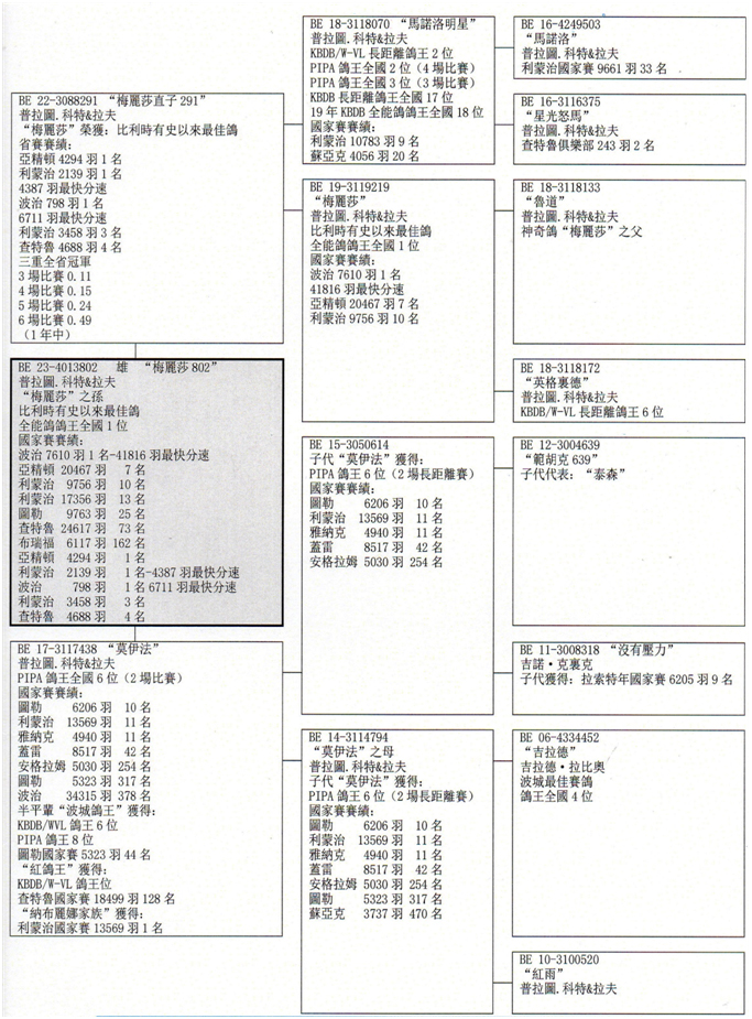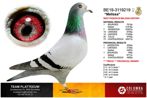祖母鴿:B19-3119219灰.母.”梅莉莎”,比利時有史以來最佳全能鴿王全國冠軍,2022年波治41.816羽冠軍,亞精頓20.467羽7位,利蒙治9.756羽10位,利蒙治17.356羽13位,圖利9.763羽25位,查特盧斯24.617羽73位。