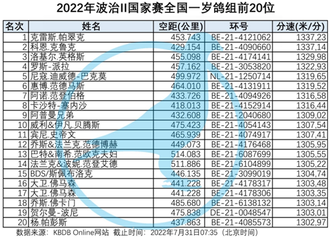 2022年比利時波治II全國賽,總參賽羽數為41.804羽冠軍中文翻譯血統書。
