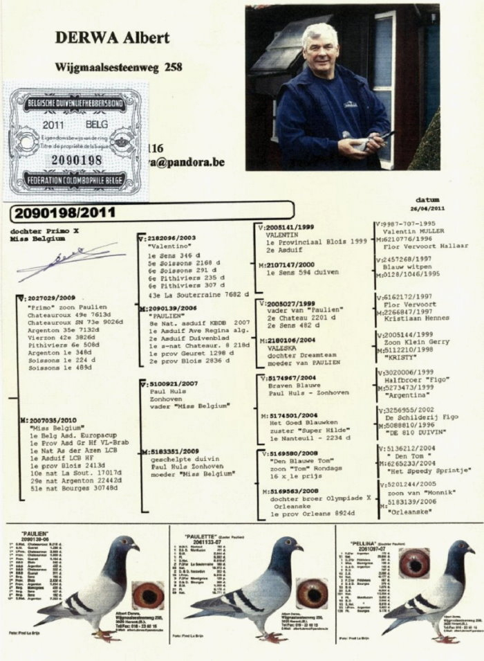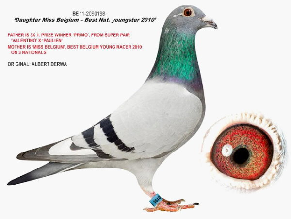 比利時中距離強豪亞伯特.德瓦(Albert Derwa)鴿舍最佳血系作出,2010年比利時三場全國賽最佳幼鴿賽“比利時小姐”作出直仔!