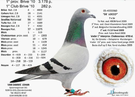 獲得冠軍者為比利時約翰.范達姆(Johan van Damme) 鴿舍,該舍的神奇鴿”洛可號B05-4333360灰公”(Locco)2005年出生(高達5歲鴿齡)老當益壯,獲得全國布瑞福16.813羽總冠軍,而且該鴿神勇無比,年年參賽,在中距離及當日賽長距離賽事翔績上已有一大串,可說每戰皆捷,而且該鴿已有出色的育種成績,再加上血統為帝盧-速霸龍"夢幻配對"的近親名血加持,如虎添翼,鴿主當初喊話,價格若未達愛力克.林柏格全國鴿王鷹眼(Ealge Eye)十餘萬歐元的水平,免談!