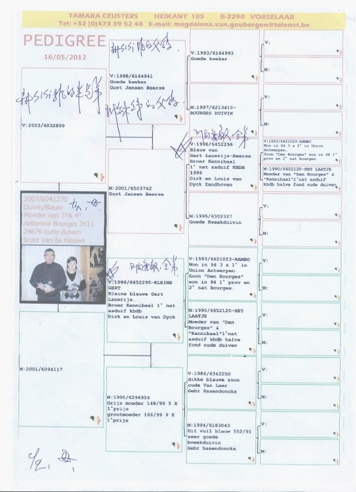 父鴿:B03-6032899灰公,為夏拉肯“新絲絲號B01-6455067”的同父半弟,也是范迪克“所向無敵”的全弟鴿B96-6452296灰公直孫。