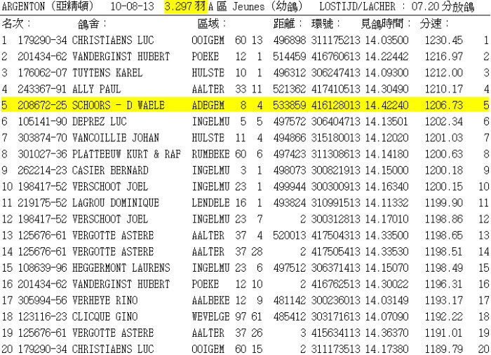 5位 Nat. Argenton 亞精頓(幼鴿) 全國A區 3.297羽 533公里